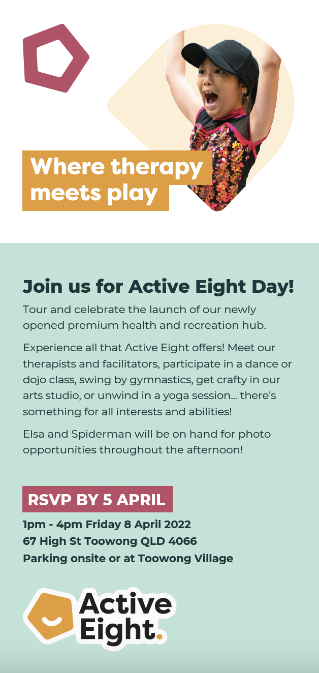 Active Eight Day is a come-and-try experience for new and current members and the general public. It is the parents/carers responsibility to provide supervision for their children AT ALL TIMES including but not limited to the participation in activities, transition from one location to another and self care. Please discuss any medical or behavioural support requirements with Active Eight staff on the day to ensure successful participation in activities. Please call Active Eight prior to the day if your child's support needs may pose a risk to the safety of themselves or others to discuss alternative options. Please note, there will also be a film crew capturing videos and photos throughout the day. It is the responsibility of the parent/carer to notify the film crew on the day if they don't wish to be included otherwise media consent will be implied. Your email address will be stored on Active Eight's community email list and you will have the opportunity to unsubscribe to any communications you receive in the future.